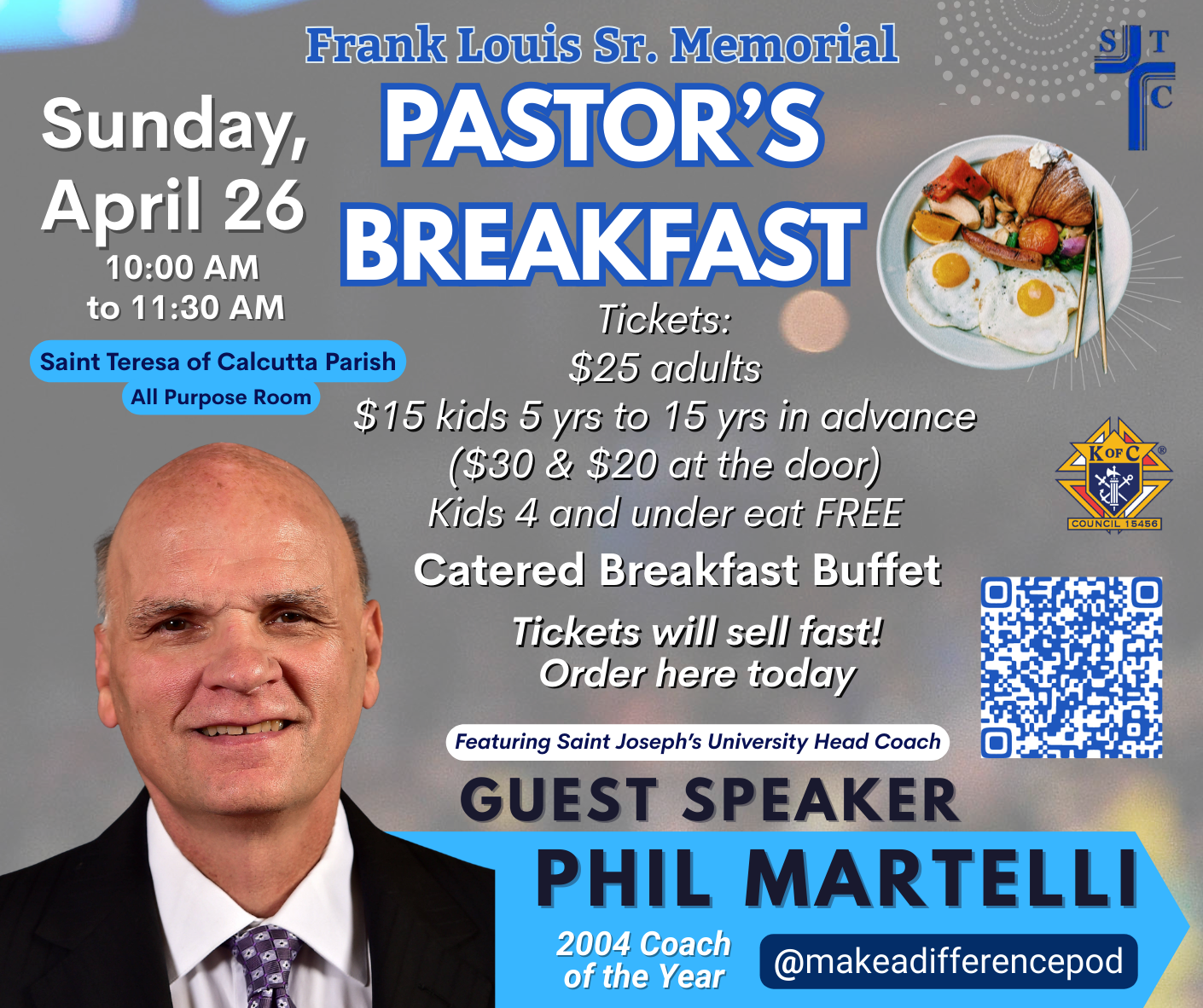 Please join us for the Frank Louis Sr. Memorial Pastor’s Breakfast with special guest speaker, Coach Phil Martelli, hosted by Knights of Columbus Council #15456. Share a meal, conversation, and faith-filled fellowship as we reflect on leadership, family, and service in our community.